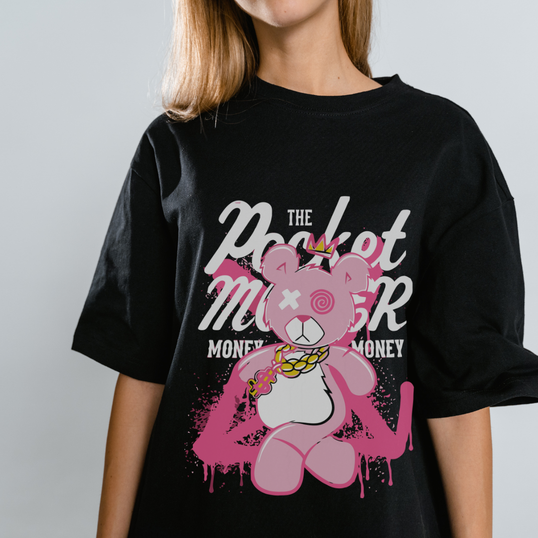 Make a loud statement with this Black Oversized T-Shirt designed for the bold and stylish! Featuring a graffiti-style pink cartoon bear with a crown and gold chain, this tee isn’t just clothingβ€”it’s street art. With its baggy fit and soft premium fabric, it delivers both comfort and confidence.